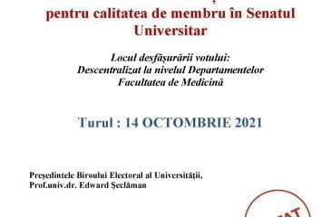 ALEGERI PARȚIALE pentru calitatea de membru în Senatul Universitar Locul desfășurării votului: Descentralizat la nivelul Departamentelor Facultatea de Medicină Turul : 14 OCTOMBRIE 2021