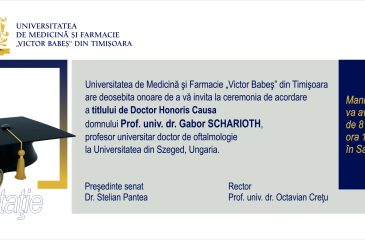 Universitatea de Medicină şi Farmacie „Victor Babeş” din Timişoara are deosebita onoare de a vă invita la ceremonia de acordare a titlului de Doctor Honoris Causa domnului Prof. univ. dr. […]
