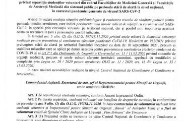 Conform Ordinului Nr. 9523 din 12.10.2021 emis de Secretarul de Stat, Șef al Departamentului pentru situații de Urgență, Dr. Raed Arafat, s-a stabilit primul grup de 44 de studenți voluntari […]