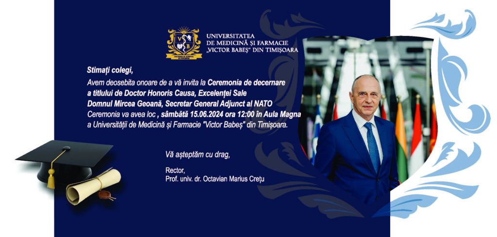 Avem bucuria și onoarea de a vă invita sâmbătă, 15.06.2024, ora 12:00, în Aula Magna a Universității de Medicină și Farmacie „Victor Babeș” din Timișoara, la ceremonia de decernare a titlului de Doctor Honoris Causa, Excelenței Sale, Domnului Mircea Geoană, Secretar Adjunct NATO.