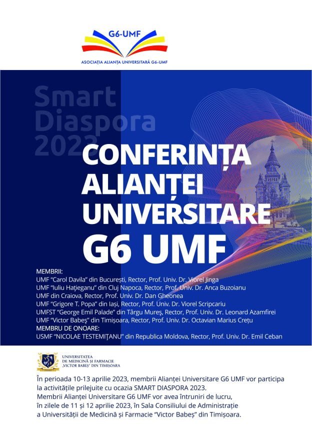 În perioada 10-13 aprilie 2023, membrii Alianței Universitare G6 UMF vor participa la activitățile prilejuite cu ocazie SMART DIASPORA 2023 și vor avea întruniri de lucru, în zilele de 11 și 12 aprilie 2023, în Sala Consiliului de Administrație a Universității de Medicină și Farmacie “Victor Babeș” din Timișoara.