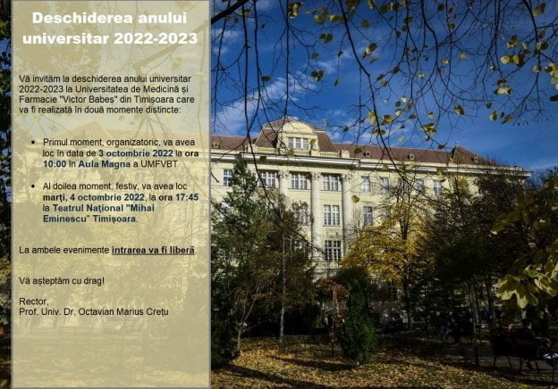Vă invităm la deschiderea anului universitar 2022-2023 la Universitatea de Medicină si Farmacie „Victor Babeș” din Timișoara care va fi realizată în două momente distincte: