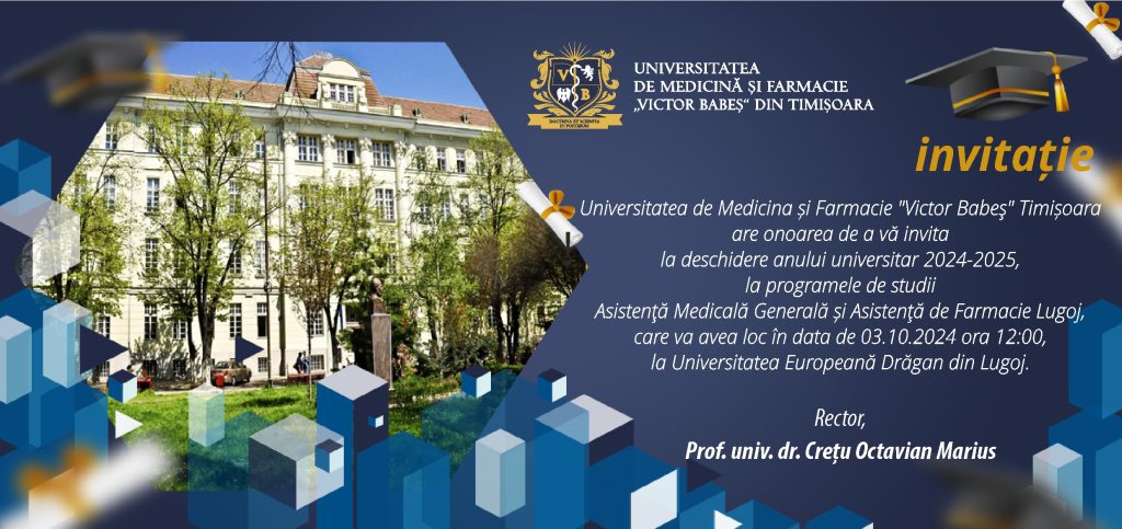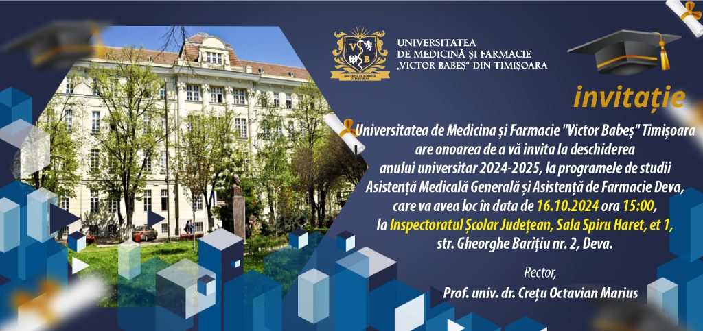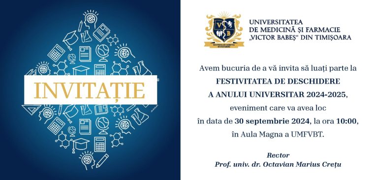 Universitatea de Medicină şi Farmacie „Victor Babeş” din Timişoara are bucuria de a vă invita să luați parte la FESTIVITATEA DE DESCHIDERE A ANULUI UNIVERSITAR 2024-2025, care va avea loc în data de 30 septembrie 2024, la ora 10.00, în Aula Magna a UMFVBT.