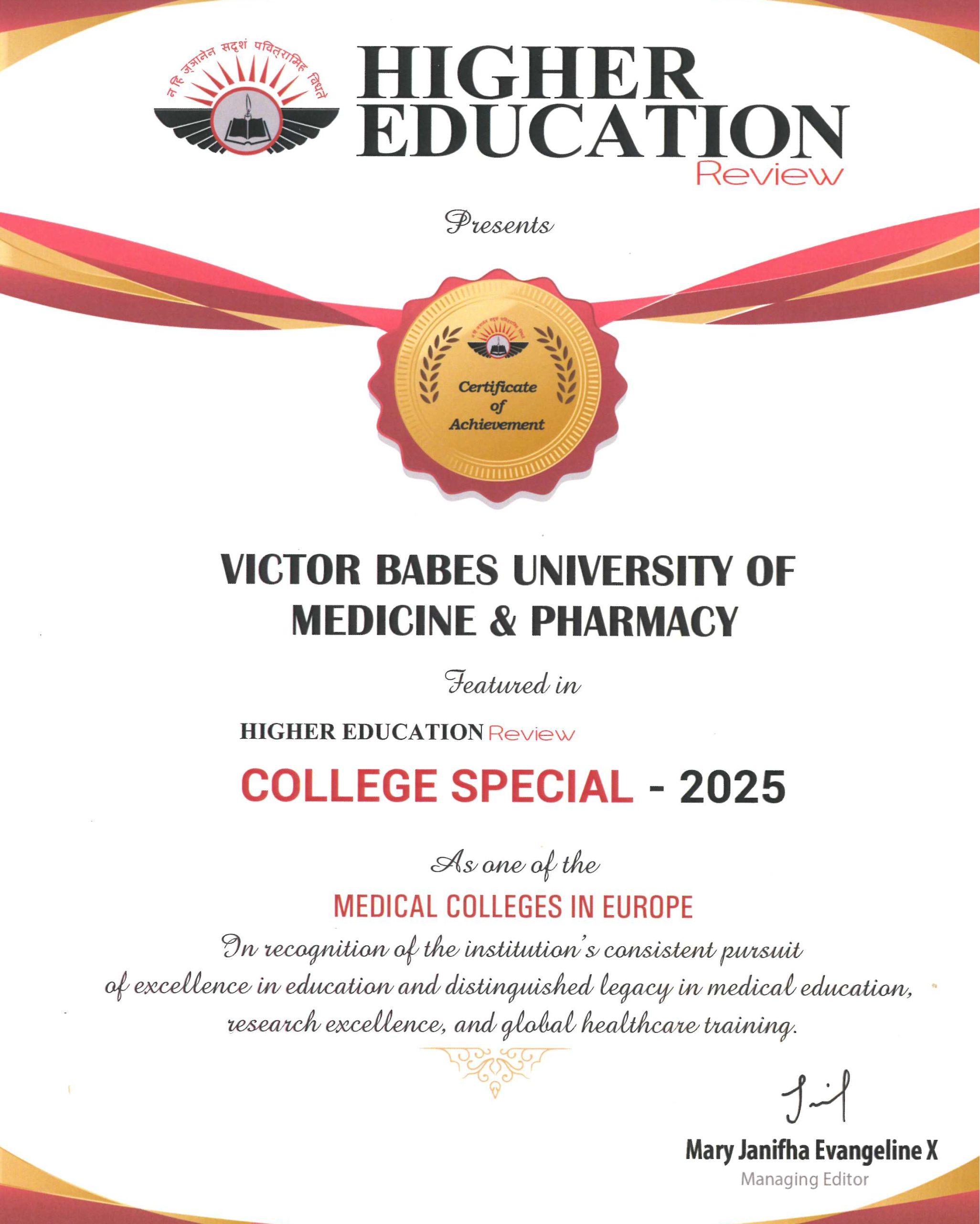 Universitatea de Medicină și Farmacie „Victor Babeș” din Timișoara primește distincția COLLEGE SPECIAL – 2025