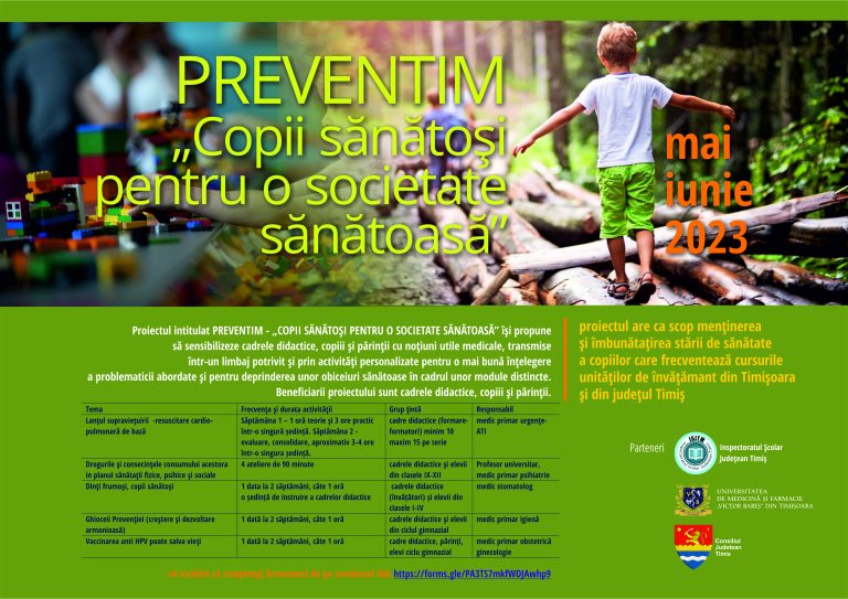 Proiectul intitulat PREVENTIM – „COPII SANATOSI PENTRU O SOCIETATE SANATOASA” își propune să sensibilizeze cadrele didactice, copiii și părinții cu noțiuni utile medicale, transmise într-un limbaj potrivit și prin activități personalizate pentru o mai bună înțelegere a problematicii abordate și pentru deprinderea unor obiceiuri sănătoase în cadrul unor module distincte. Beneficiarii proiectului sunt cadrele didactice, copiii și părinții.