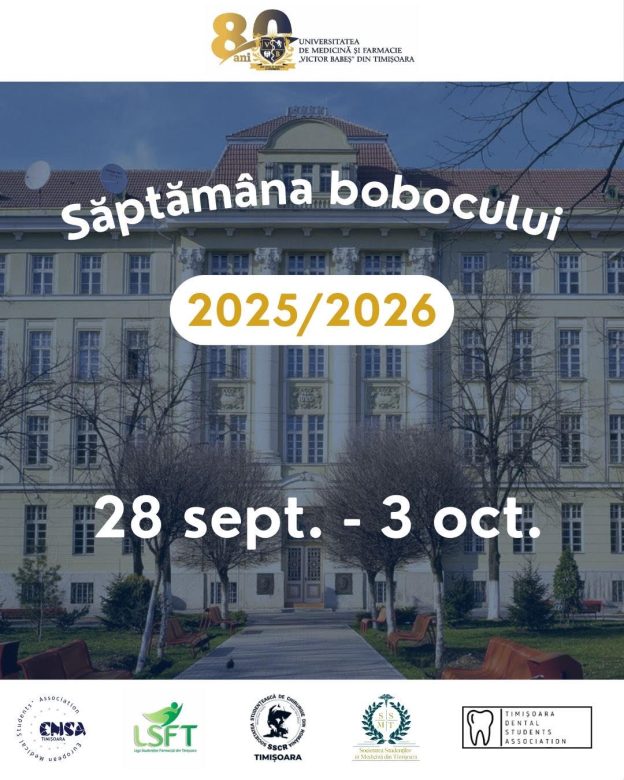 - 14:00–18:00 — „First steps into the world of surgery” (workshop) – SSCR & SSMT, Medicină 1, Pț. Eftimie Murgu
