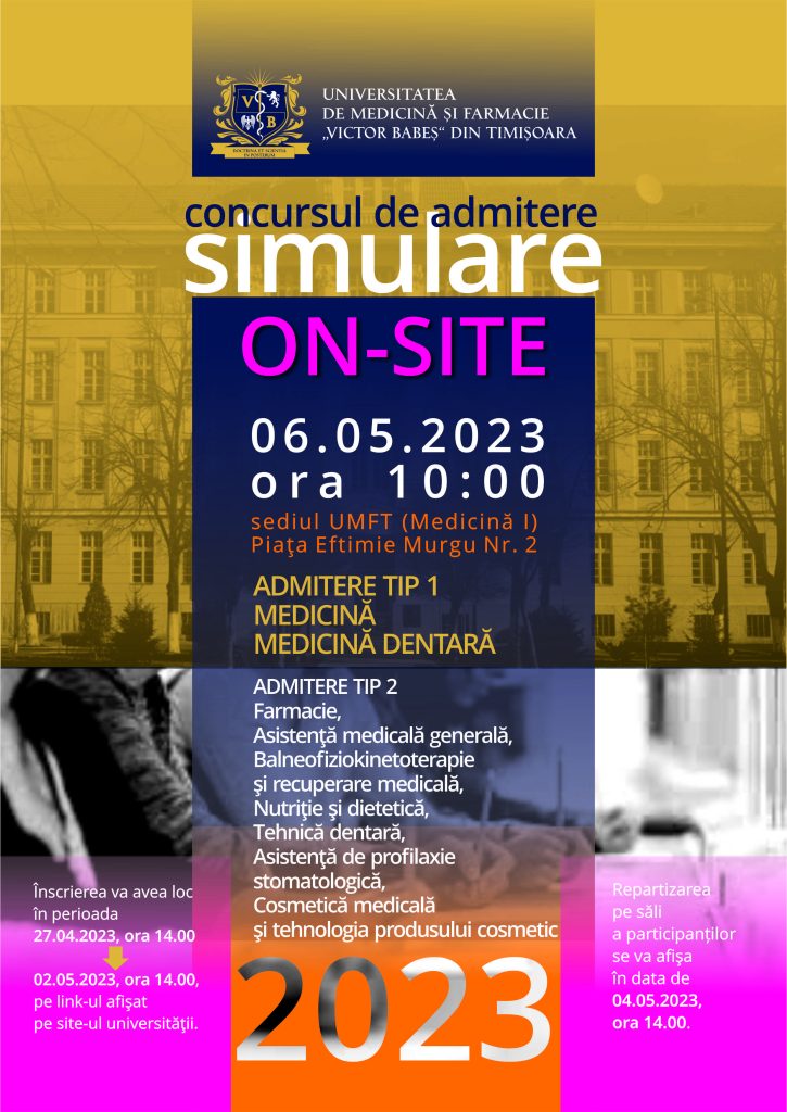 În data de 06.05.2023, ora 10:00, la sediul UMFT (Medicină I), Piaţa Eftimie Murgu Nr. 2, Timişoara va avea loc simularea pentru concursul de admitere din anul 2023.