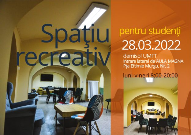 Începând de luni, 28.03.2022, se deschide “Spațiul recreativ pentru studenți”, situat la demisolul clădirii din locația centrală a UMFT, Pța Eftimie Murgu, Nr. 2, cu intrarea lateral de AULA MAGNA.